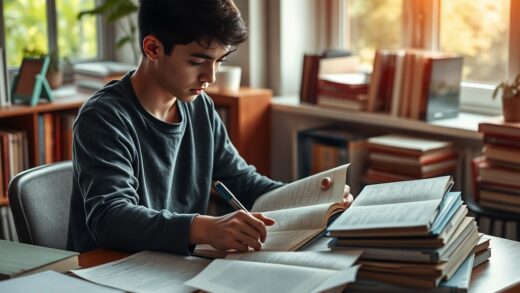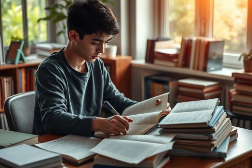На изображении подросток читает книгу за столом, окружённый высокими стопками учебников и заметками.